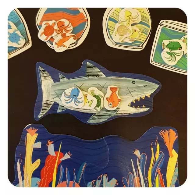 Tenemos cuatro peceras llenas de animales separados por colores y debemos liberalos al océano. ¡Pero ojo! ¡Un tiburón anda al acecho! Tiramos los dados y éstos nos indican qué animal y color podemos liberar al océano o dejar en la panza del tiburón, según la suerte. ¡Pero entre todos podemos salvar a los animales! Si salen 2 tiburones, todos quedan libres. Un juego de mesa simple y didáctico para que lo más chicos aprendan a ser pacientes, a seguir reglas y a cooperar con el otro.
